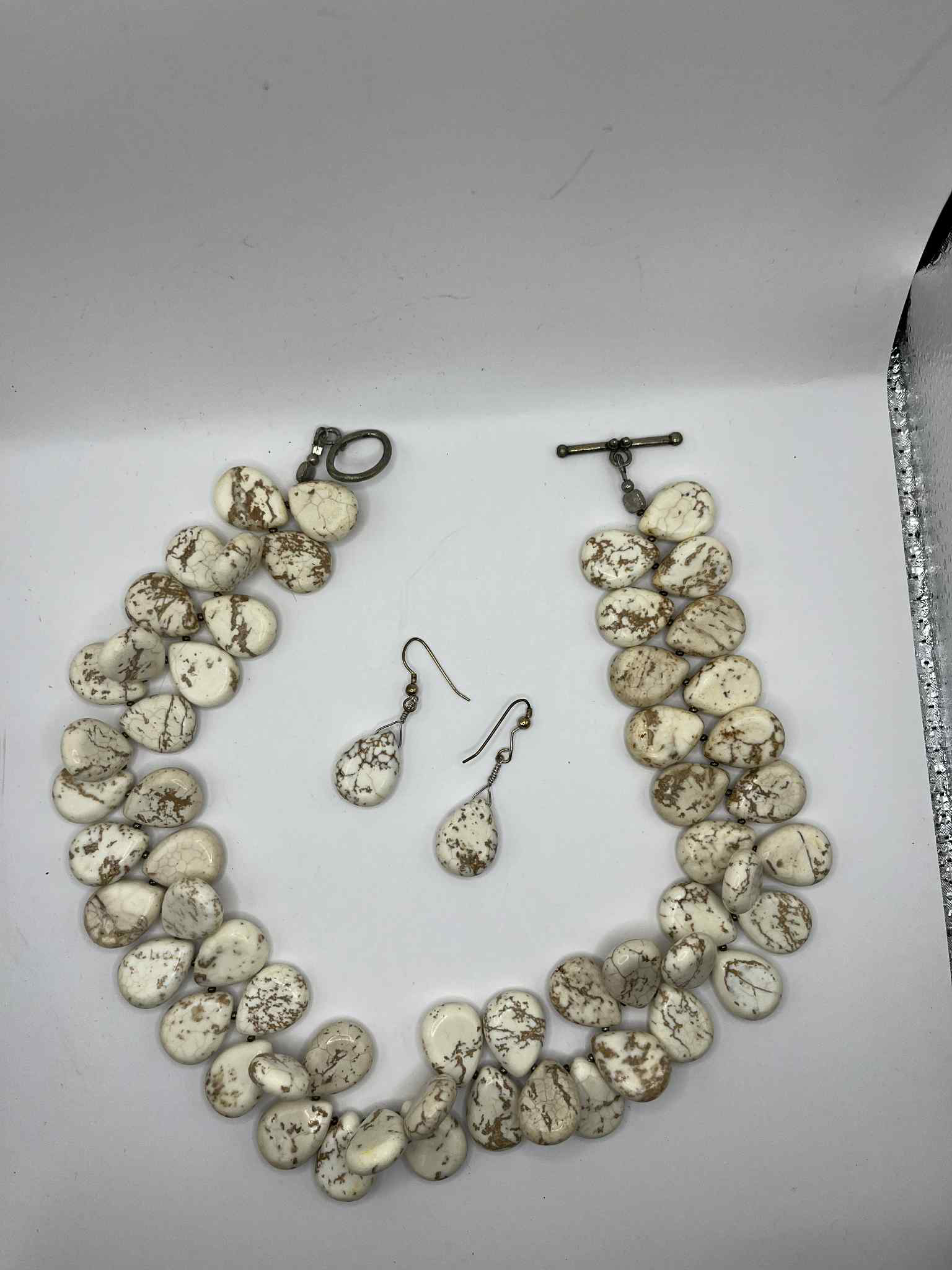 Elevate your look with this handcrafted white howlite teardrop necklace and earring set. The double-strand necklace features polished, natural howlite stones with earthy brown veining, creating a striking marbled effect. Each stone is unique, adding organic charm and a bohemian touch to your style.