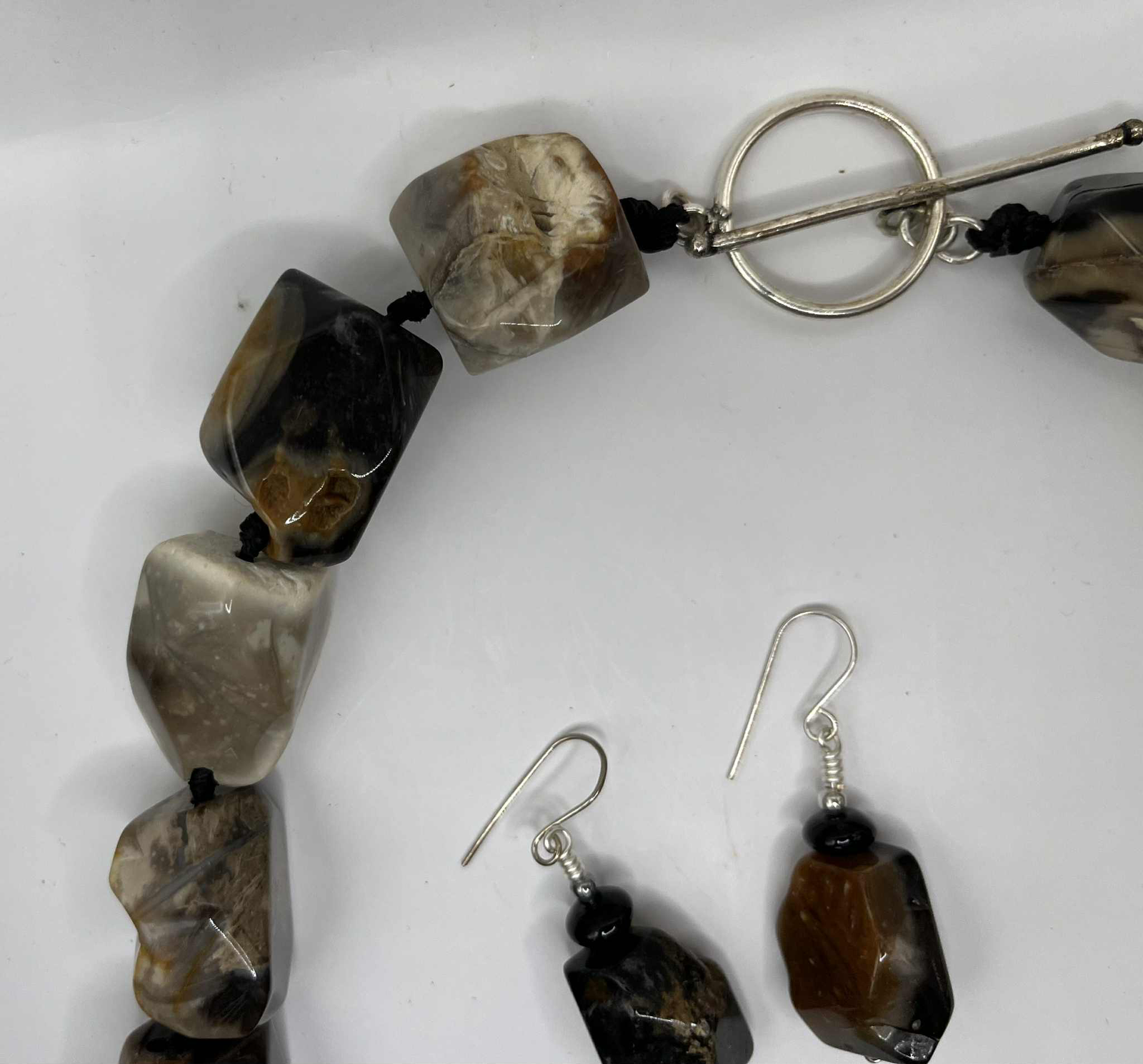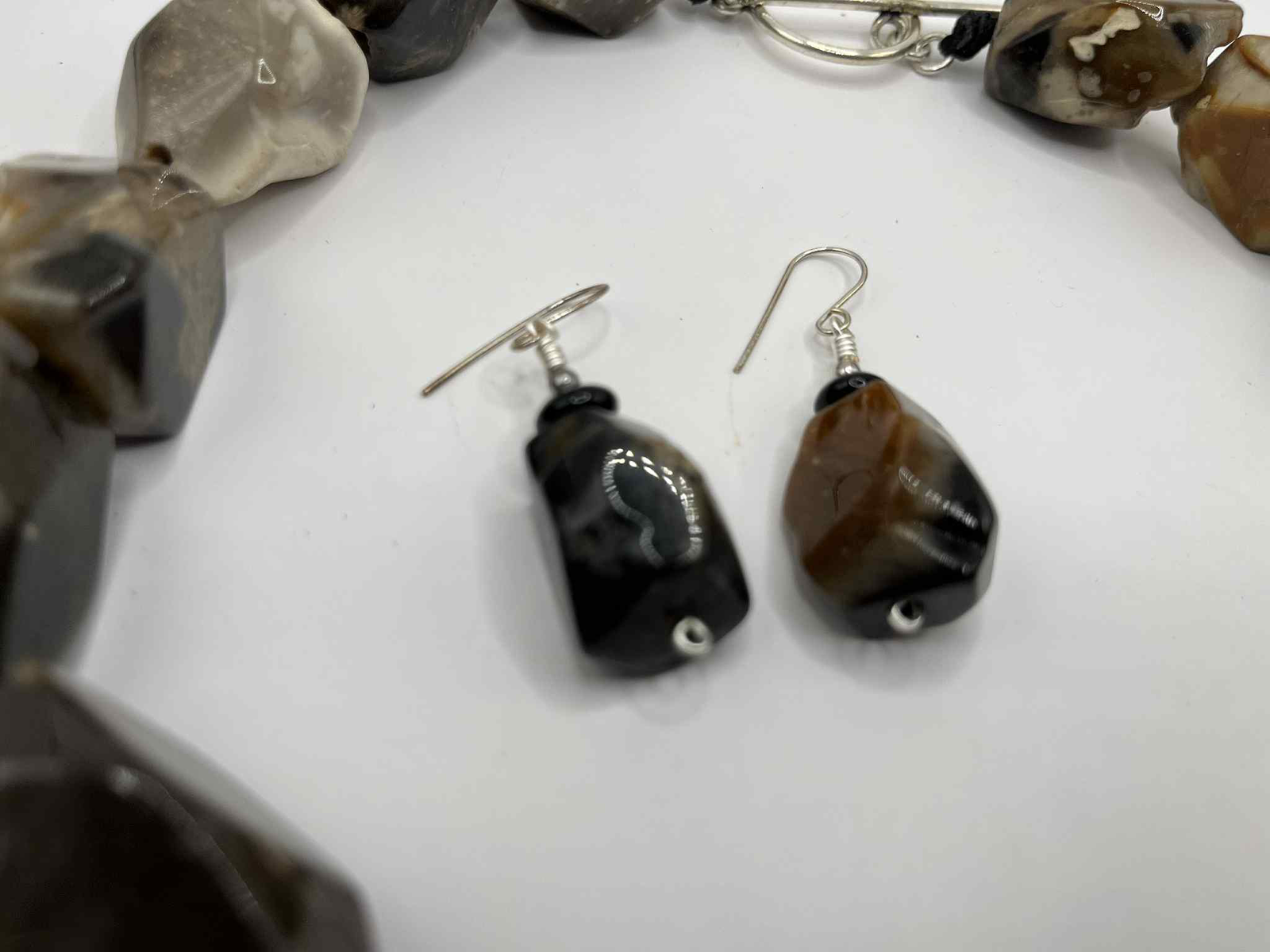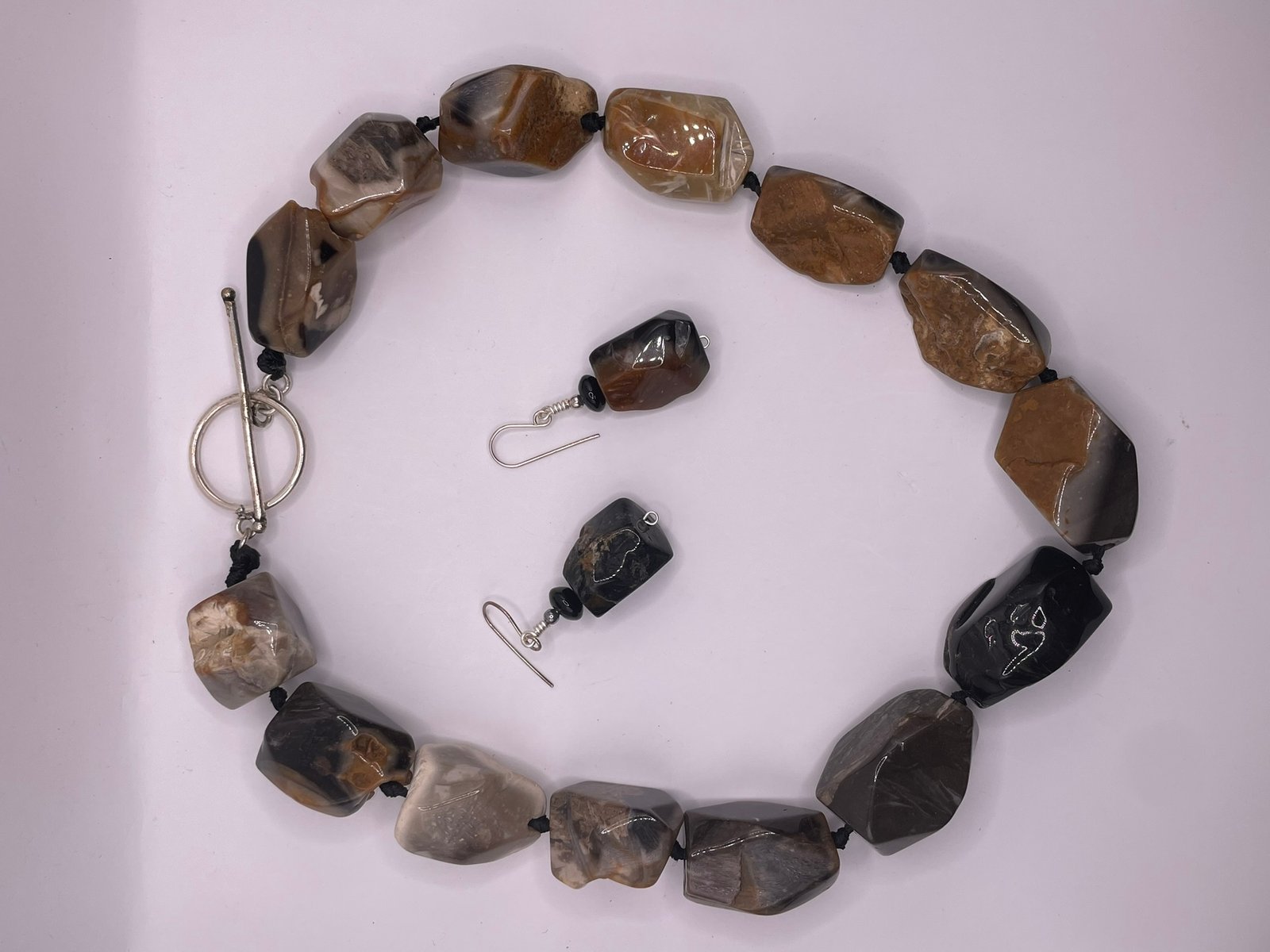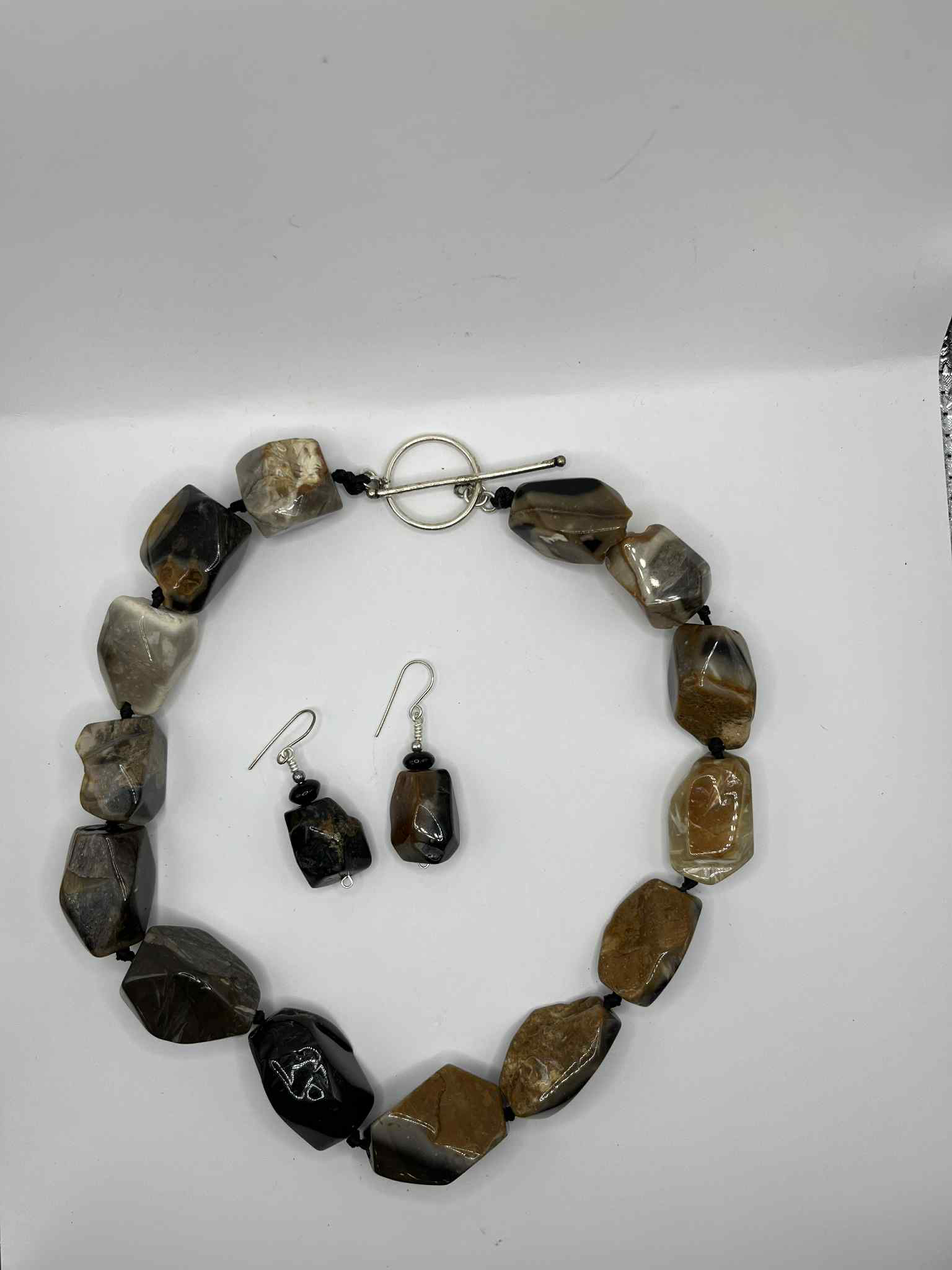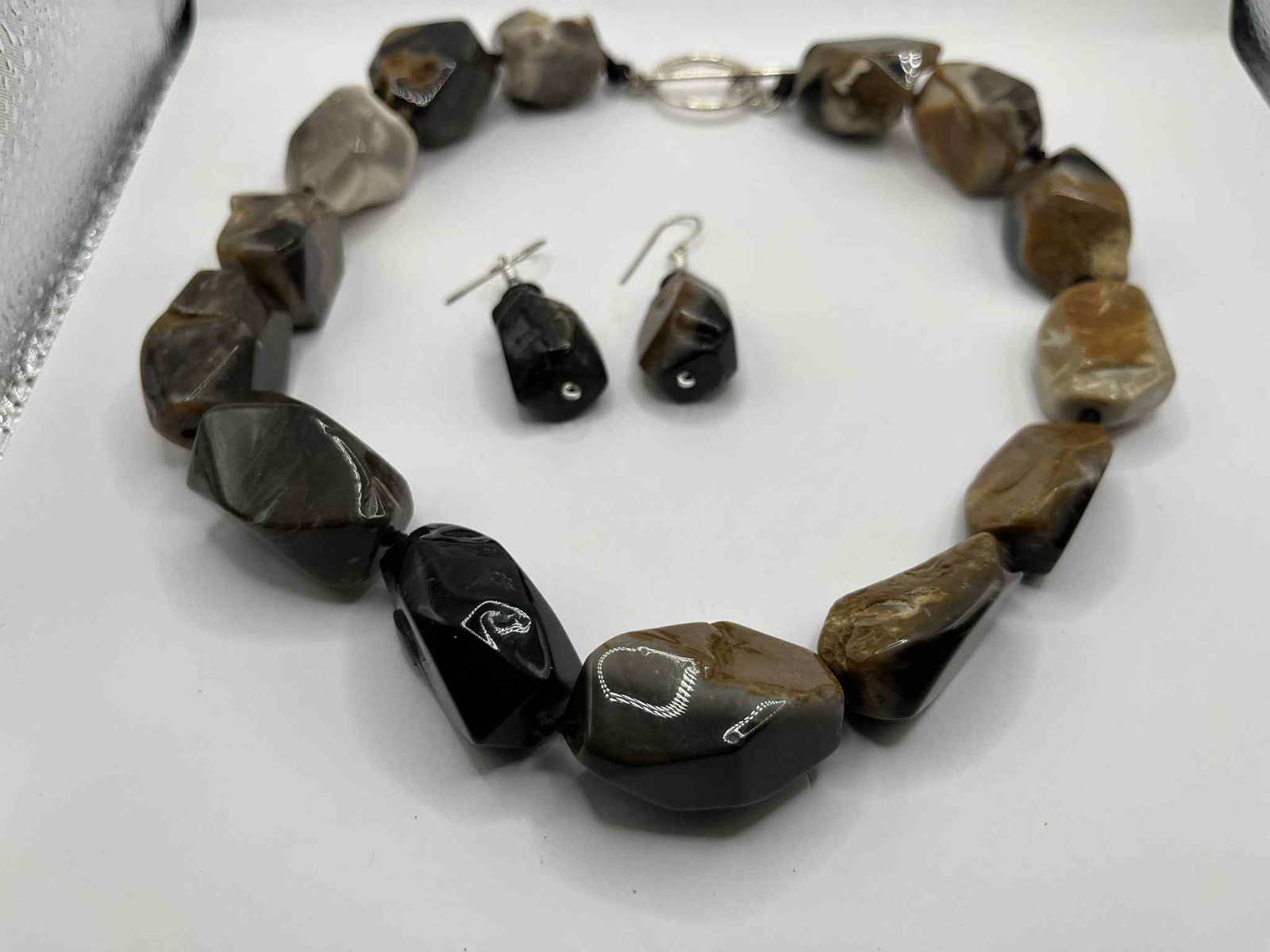 Turn heads with this striking artisan-made necklace and earring set, crafted from large, freeform banded agate nuggets in rich shades of smoky grey, caramel, cream, and jet black. Each stone displays unique natural banding and plume-like patterns, making this set truly one of a kind.