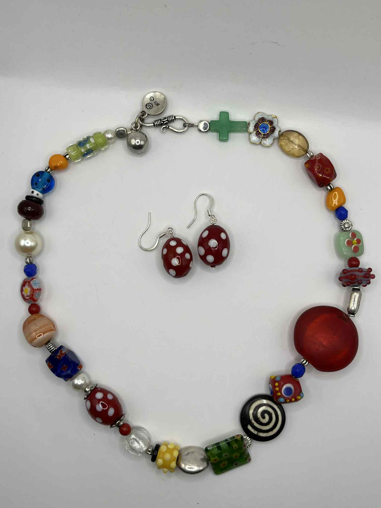 From bold red polka-dot beads to swirling spirals, flowers, and textured designs, this necklace celebrates the artistry of glassmaking traditions with a modern bohemian flair. The matching earrings complete the look, making this set perfect for casual wear, artistic gatherings, or statement accessorizing.