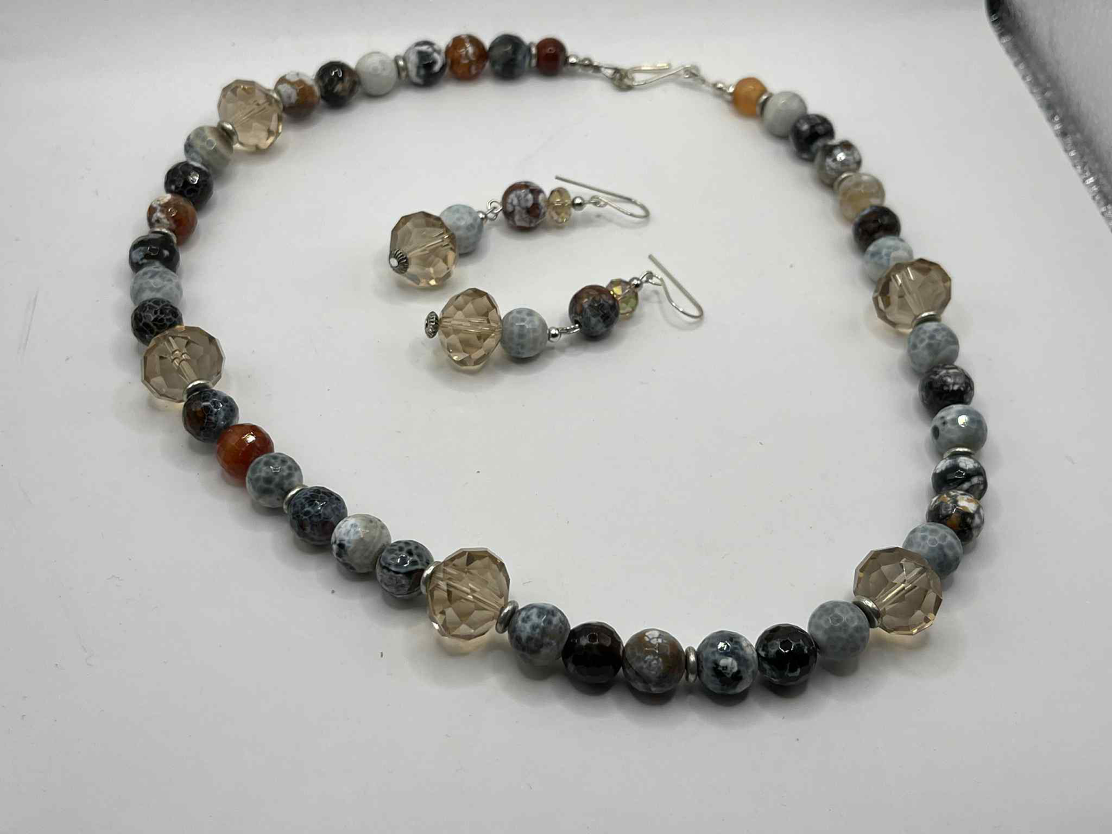 Elevate your look with this artisan-crafted gemstone jewelry set, featuring a statement necklace and matching earrings. The design pairs faceted crackle agate beads—renowned for their striking web-like patterns in earthy grays, blacks, whites, and rust—with smoky quartz-style faceted crystals that add depth and shimmer. Each bead is unique, giving the set a truly one-of-a-kind character.