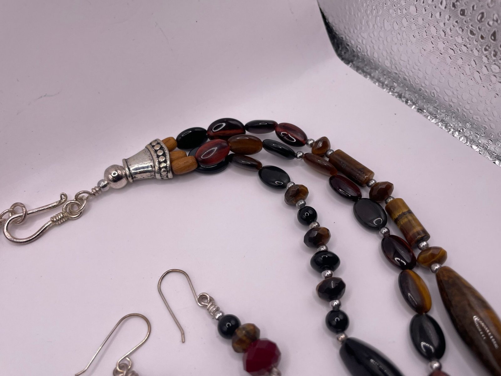 Tiger’s eye; black onyx/glass; hematite-like metal rounds/spacers; red faceted glass; modern Dzi-style agate beads; silver-tone/Bali-style cone end caps; S-hook clasp.