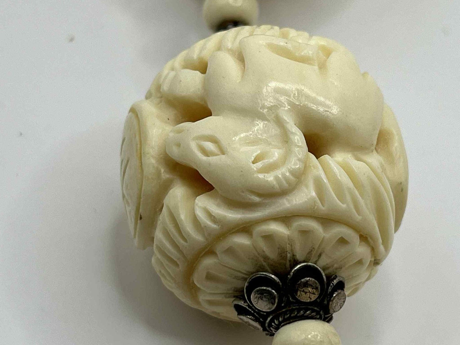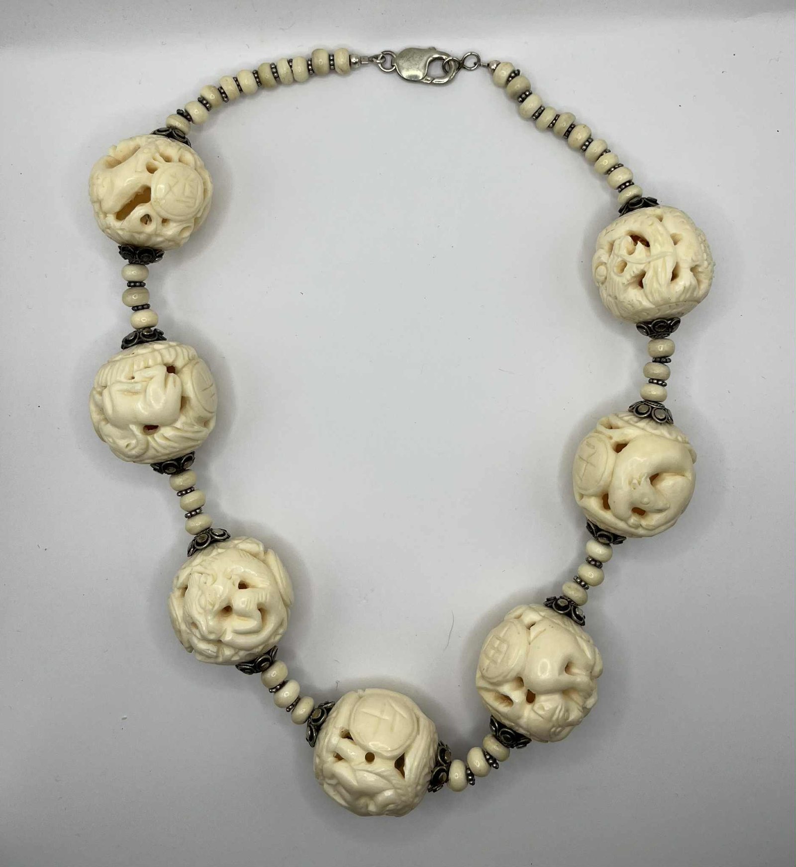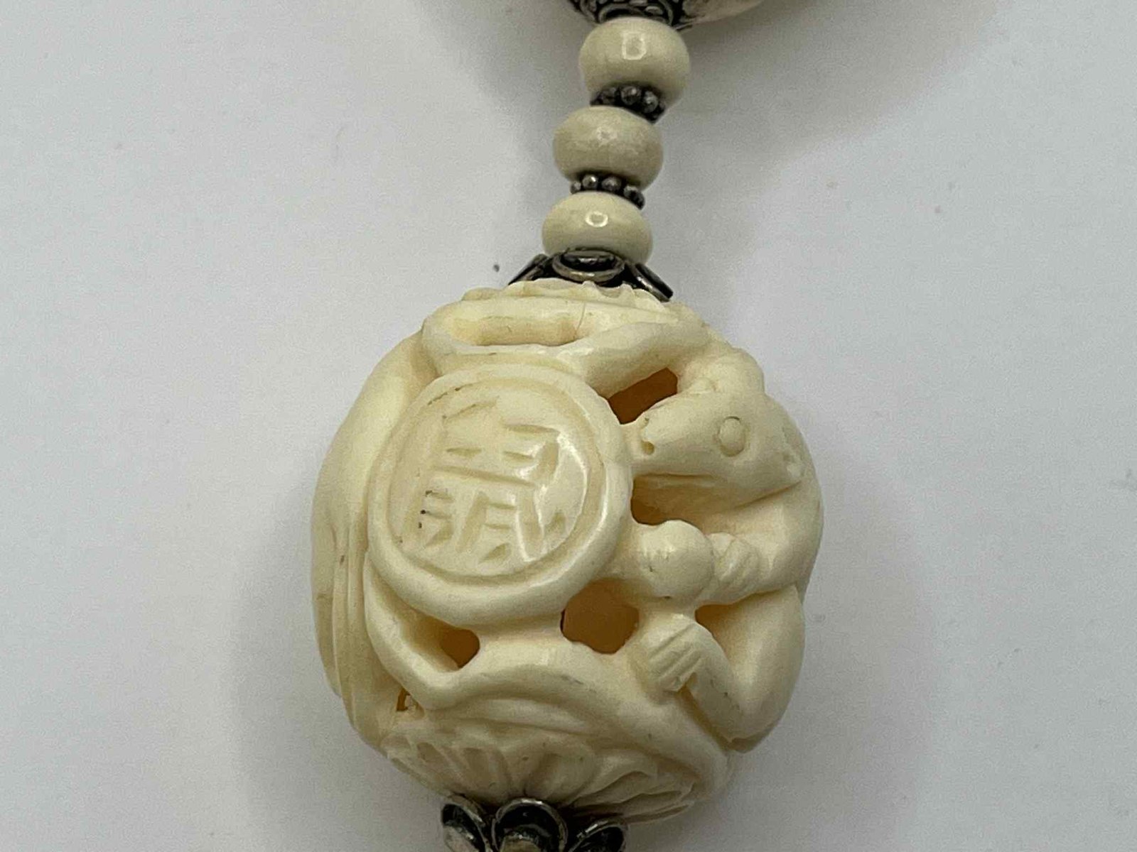 Vintage Hand-Carved Chinese Zodiac Bone Necklace with Sterling Silver Accents (A100)