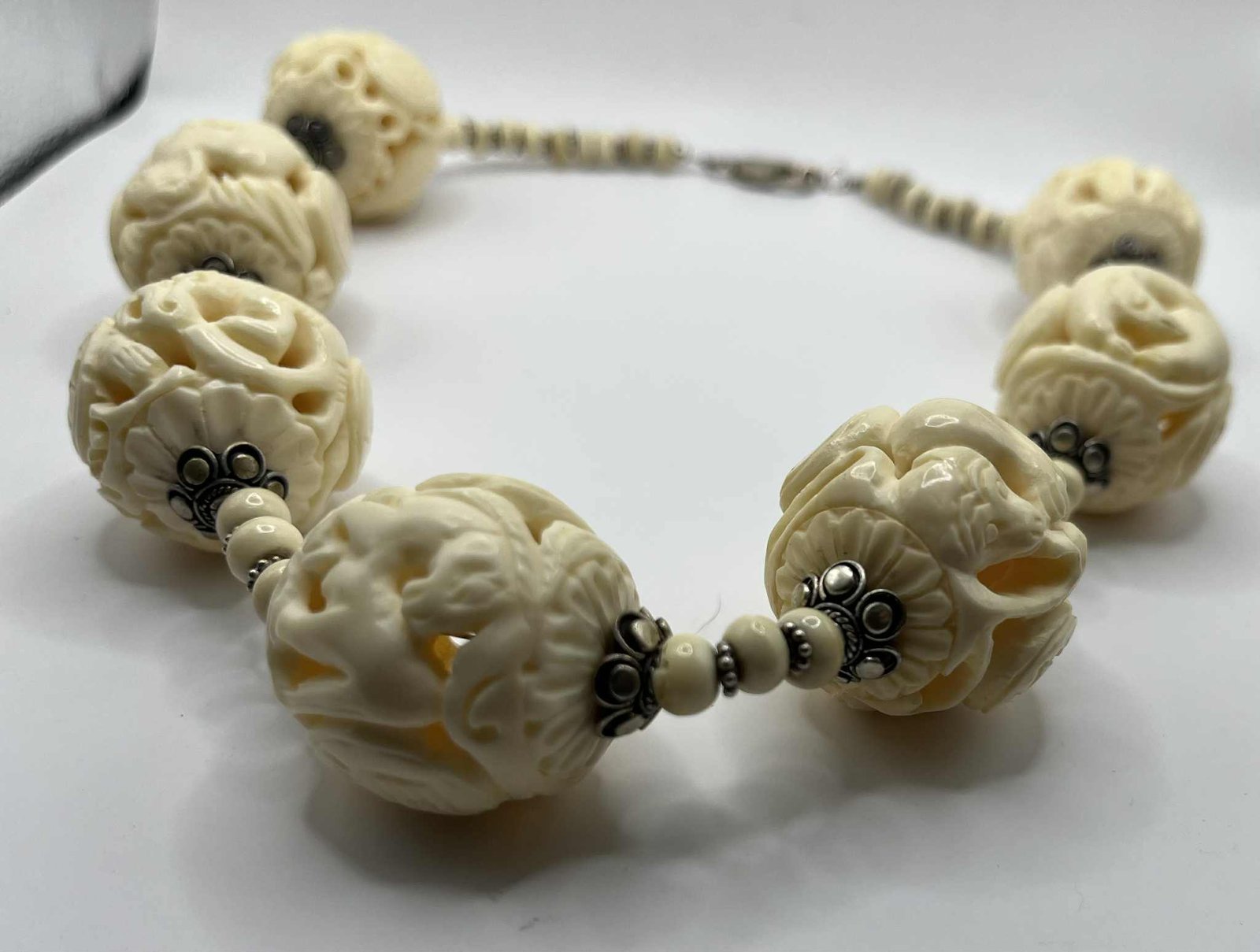 Step into a world where artistry meets symbolism with this remarkable vintage statement necklace. Each oversized bead is hand-carved from creamy ox bone, bringing to life one of the twelve Chinese Zodiac animals in stunning three-dimensional detail. The deep piercings and ornate floral frames enhance the intricate craftsmanship, while sterling silver bead caps and rondelles lend a refined, timeless elegance.